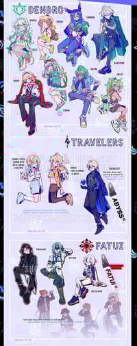 78.5 genshin characters in sIcK fItSπ―, printed on coloured acrylic (ie. hydro characters will be printed on a translucent blue background, electro purple, etc.) and coated with a sturdy epoxy. size varies from 4" to 6" depending on character!