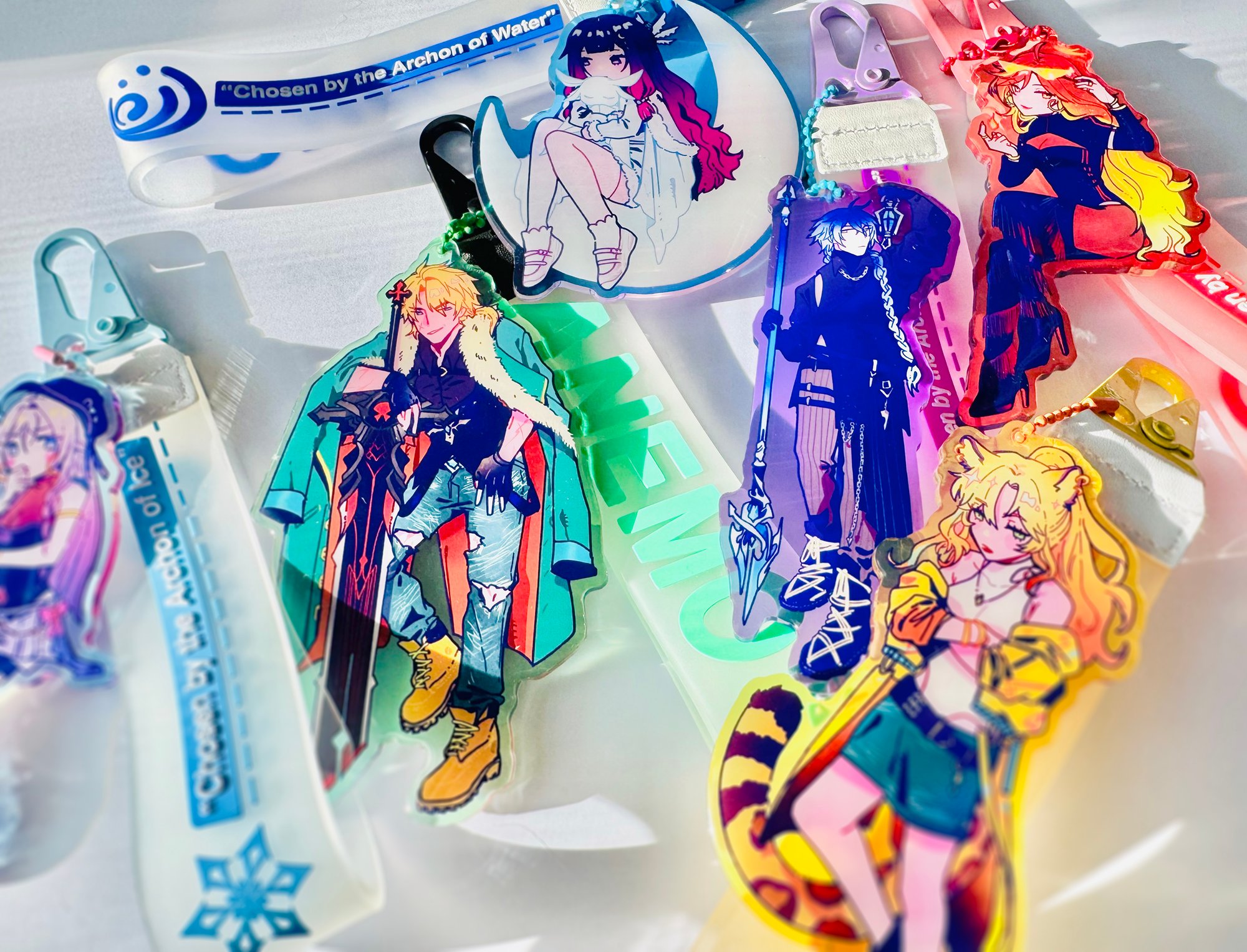 15 natlan/nod-krai genshin characters in sIcK fItS💯, printed on coloured acrylic (ie. hydro characters will be printed on a translucent blue background, electro purple, etc.) and coated with a sturdy epoxy.